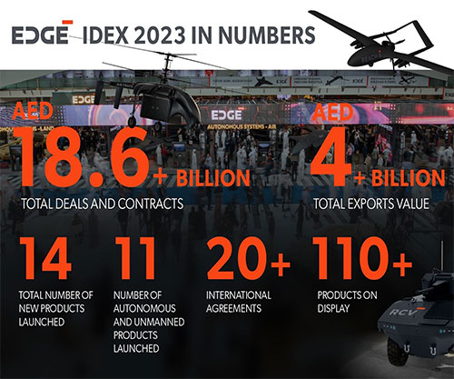 EDGE, one of the world’s fastest growing and leading advanced technology and defence groups, has concluded its highly successful participation at IDEX 2023, launching 14 new products, including 11 breakthrough autonomous and unmanned products and solutions, the signing of new contracts and deals worth AED 18.6 billion US$ 5.1 billion), of which AED 4 billion was in international export deals, and several partnerships and agreements signed with leading OEMs, defence and technology companies, and suppliers.