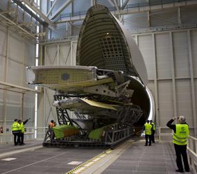 The picture shows the unloading of the wing from an Airbus Beluga in the A400M final assembly line.