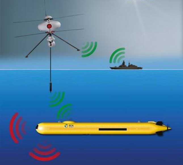 Commonly used by aircraft to detect enemy submarines (or non-cooperative vehicles), dipping sonars are used completely differently with this new solution. First, the aerial and underwater vehicles form a cooperative network. Second, the communications sonar operates at much higher frequencies which results in a lighter (< 10 kg) and more power-efficient device. One could imagine it being mounted on a small aerial drone.