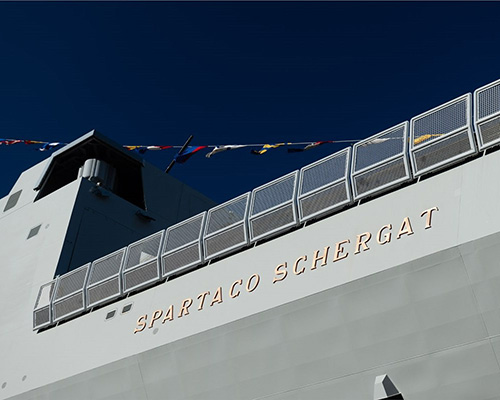 After the launching, fitting activities will continue in the integrated naval shipyard of Muggiano (La Spezia), with delivery scheduled in 2020. The “Spartaco Schergat” vessel, like the other units, will feature a high degree of flexibility, capable of operating in all tactical situations. 144 meters long with a beam of 19.7 meters, the ship will have a displacement at full load of approximately 6,700 tons. The vessel will have a maximum speed of over 27 knots and will provide accommodation for a 200-person crew.