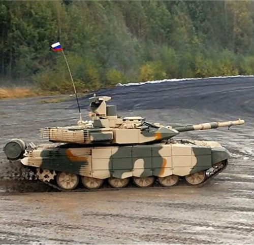 The main armament includes a 125mm high-accuracy gun 2A46M-5 with new features as the installation of high-rigidity barrel tube, play-free trunnion assembly units with elastic rollers an return wedge and two additional play take-up elements with rollers. The 2A46M-5 gun design made it possible to reduce technical dispersion of shells of all types by 15% in average and to increase effective range of fire. A 7.62mm coaxial machine gun 6P7K is coupled to the 125mm gun. The T-90MS carries 40 rounds of 125mm, 22 are ready to be used on an automatic carousel autoloader, other ammunitions are stowed in a special hull rear section to avoid the risks of explosion and provide high crew survivability.