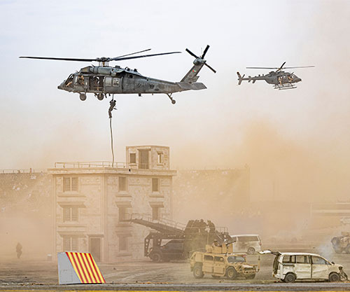 These field scenarios include hostage rescue operations on a hijacked ship at sea, responding to an attack or ambush on a VIP convoy, countering assassination attempts on a VIP, launching airstrikes on hostile targets, performing beach assaults involving amphibious and airborne deployments, carrying out evacuations of wounded personnel with air cover, and providing security measures for major events using robotic technology, artificial intelligence, and drones, among other scenarios.